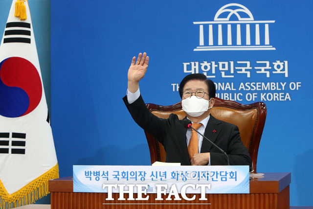[더팩트ㅣ국회=남윤호 기자] 박병석 국회의장이 6일 오전 서울 여의도 국회에서 화상으로 진행된 신년 기자간담회에 참석해 인사하고 있다.
