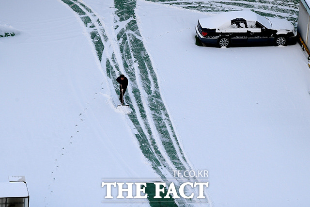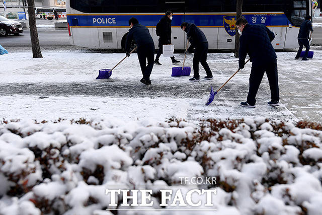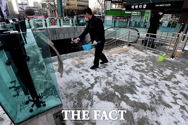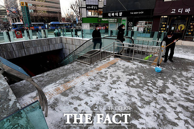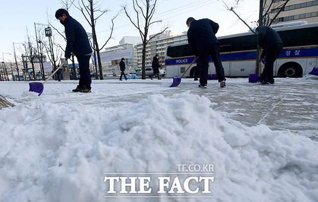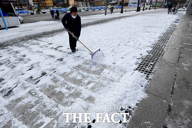 [더팩트ㅣ이선화 기자] 전날 내린 폭설로 기온이 최저 영하 20도까지 떨어진 가운데 7일 오전 서울 종로구 세종문화회관 앞에서 관계자들이 제설작업을 하고 있다.