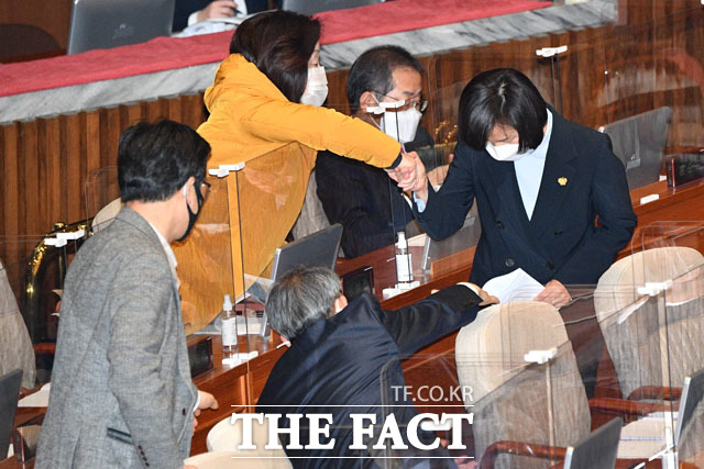 [더팩트ㅣ국회=남윤호 기자] 강은미 정의당 원내대표(오른쪽)가 8일 오후 서울 여의도 국회에서 열린 본회의에서 중대재해 처벌 등에 관한 법률안에 대한 토론을 마친 뒤 심상정 의원 등에게 격려 받고 있다.ilty012@tf.co.kr사진영상기획부 photo@tf.co.kr