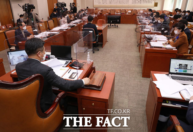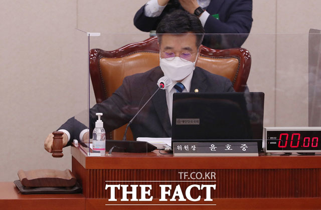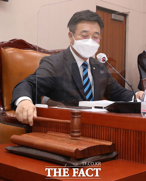 [더팩트ㅣ국회=남윤호 기자] 윤호중 국회 법제사법위원장이 14일 오후 서울 여의도 국회에서 열린 법제사법위원회 전체회의에서 의사봉을 두드리고 있다.