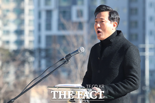 [더팩트ㅣ국회사진취재단] 오세훈 전 서울시장이 17일 오전 서울 강북구 북서울꿈의숲에서 기자회견을 열고 서울시장 보궐선거 출마를 선언하고 있다.