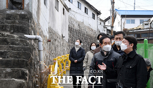 [더팩트ㅣ국회사진취재단] 서울시장 출마를 선언한 안철수 국민의당 대표(오른쪽)가 17일 오후 서울 종로구 사직 제2구역를 찾아 도시재개발이 시급한 서울시민의 주거현장을 점검하고 있다.