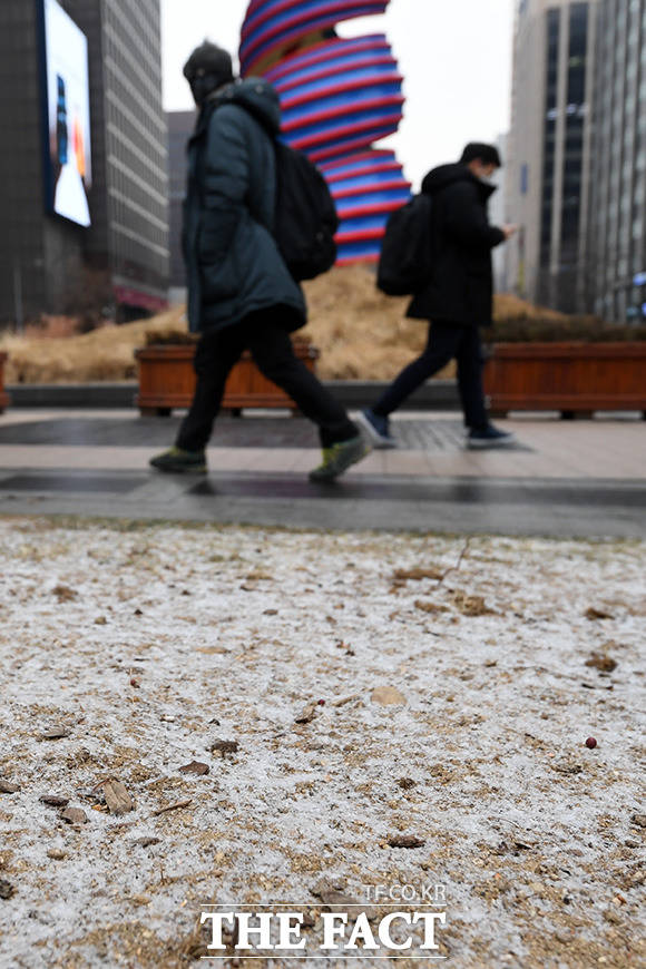 [더팩트ㅣ남용희 기자] 폭설로 인해 출근길 혼잡이 발생할 것이라는 예보와는 다르게 수도권에 예상보다 적은 눈이 내린 18일 오전 서울 종로구 광화문 일대에서 시민들이 출근길 발걸음을 재촉하고 있다.