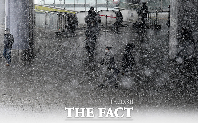 [더팩트ㅣ이선화 기자] 전국 대부분 지방에 폭설이 예보된 18일 오전 서울 중구 서울역 앞에서 시민들이 내리는 눈을 피해 걸음을 재촉하고 있다.