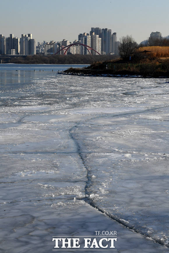 [더팩트ㅣ임세준 기자] 중부지방에 한파특보가 발효된 19일 오전 서울 영등포구 여의도 인근 한강에 얼음이 얼어있다. 서울 등 중부와 경북 내륙을 중심으로 한파특보가 발효 중인 가운데 이번 추위는 내일 낮부터 차츰 누그러질 것으로 예상된다.