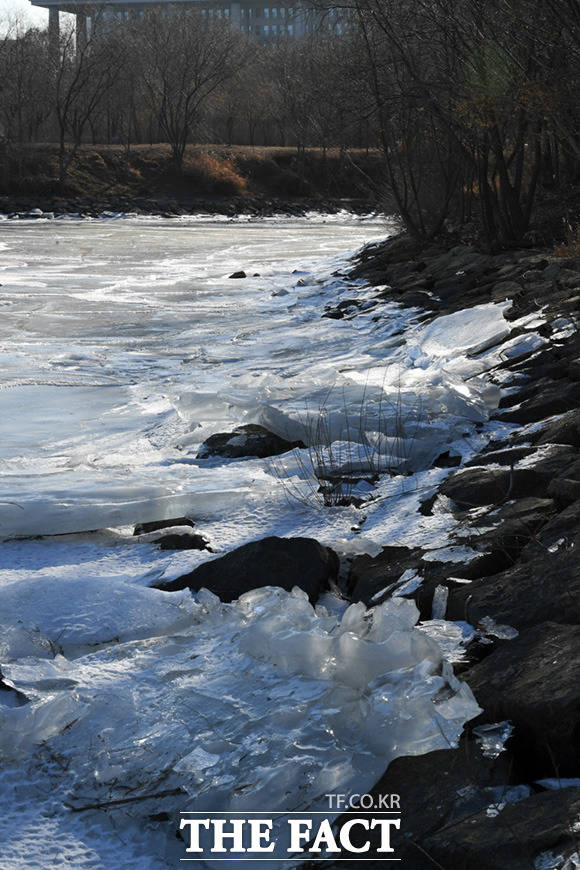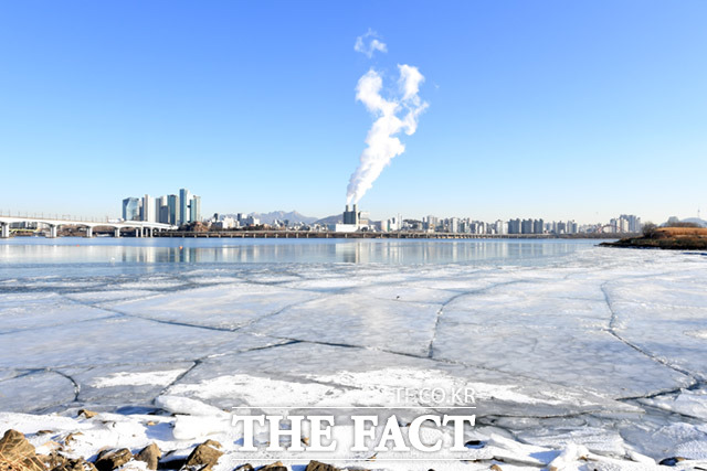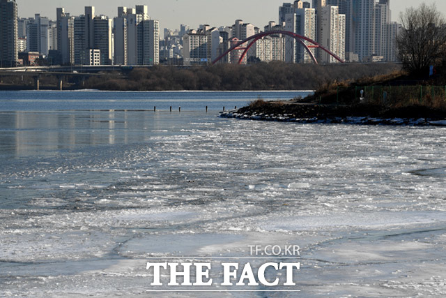 [더팩트ㅣ임세준 기자] 중부지방에 한파특보가 발효된 19일 오전 서울 영등포구 여의도인근 한강에 얼음이 얼어있다. 서울 등 중부와 경북 내륙을 중심으로 한파특보가 발효 중인 가운데 이번 추위는 내일 낮부터 차츰 누그러질 것으로 예상된다.