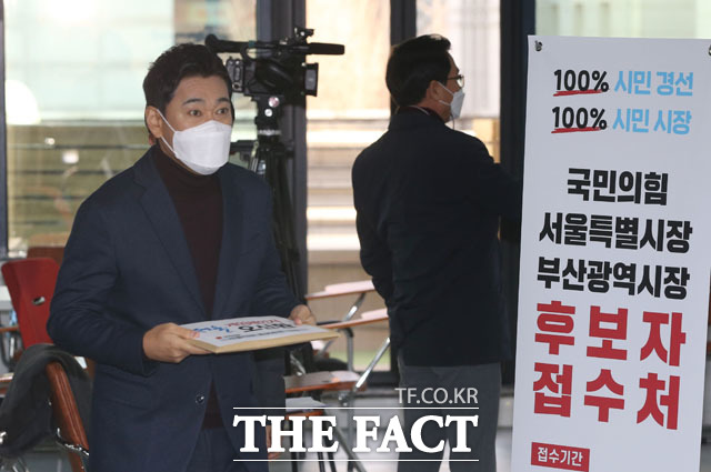 [더팩트ㅣ남윤호 기자] 오신환 국민의힘 전 의원(왼쪽)이 20일 오전 서울 여의도 국민의힘 당사를 방문해 4·7 서울시장 보궐선거 국민의힘 경선 후보자 등록을 하고 있다.
