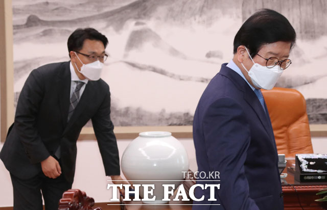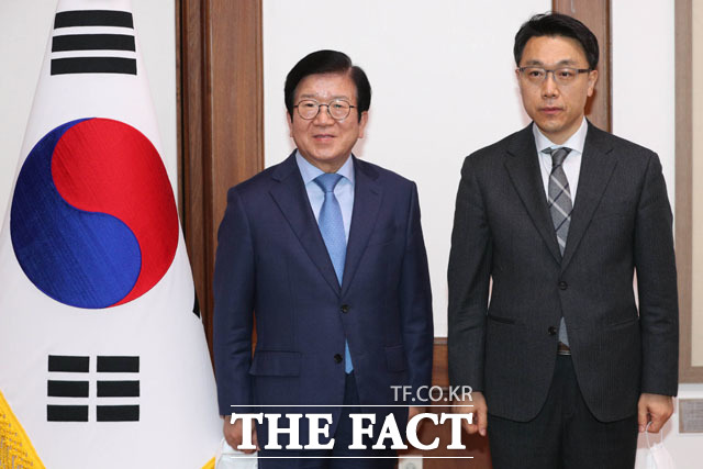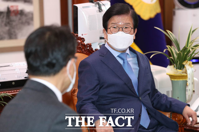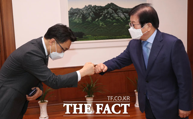 [더팩트ㅣ국회=남윤호 기자] 김진욱 신임 고위공직자범죄수사처장(왼쪽)이 26일 오후 서울 여의도 국회에서 박병석 국회의장을 예방해 박 의장과 환담을 나누고 있다.