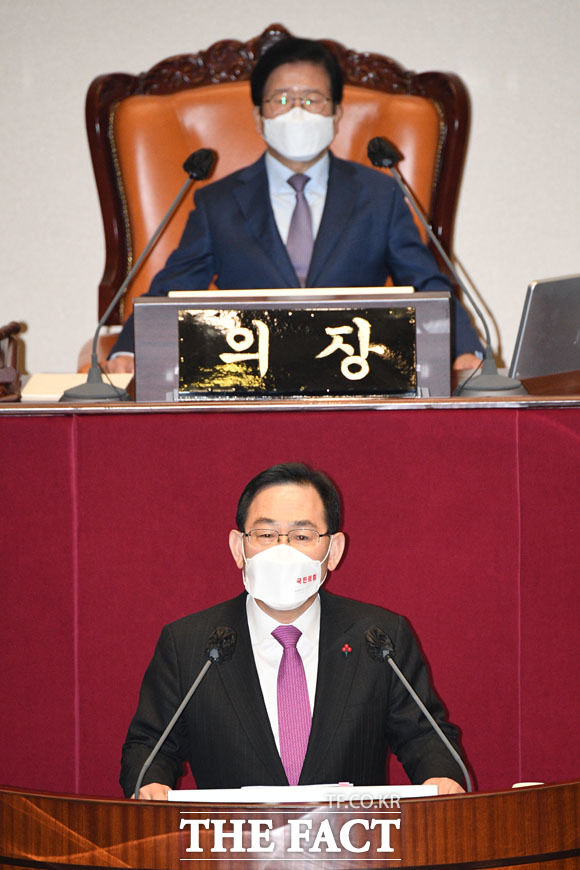[더팩트ㅣ국회=남윤호 기자] 주호영 국민의힘 원내대표가 3일 오전 서울 여의도 국회에서 열린 본회의에서 국정에 관한 교섭단체대표연설을 하고 있다.
