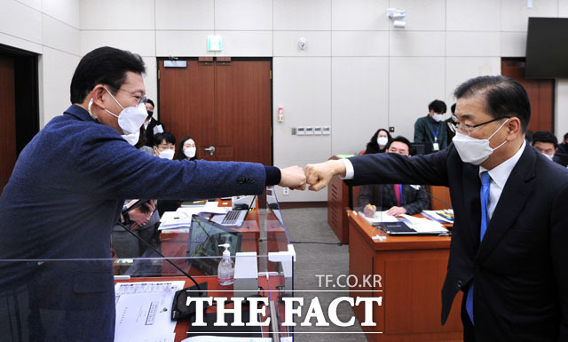 [더팩트ㅣ국회=남윤호 기자] 정의용 외교부 장관 후보자(오른쪽)가 5일 오전 서울 여의도 국회에서 열린 인사청문회에출석해 송영길 위원장에게 선서문을 제출하며 주먹인사를 하고 있다.