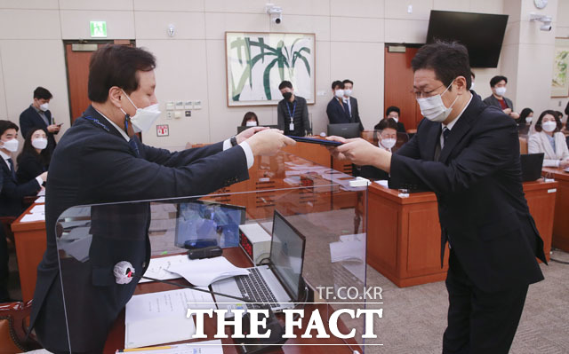 [더팩트ㅣ국회=남윤호 기자] 황희 문화체육관광부 장관 후보자(오른쪽)가 9일 오전 서울 여의도 국회에서 열린 문화체육관광위원회 인사청문회에 출석해 도종환 위원장에게 선서문을 제출하고 있다.