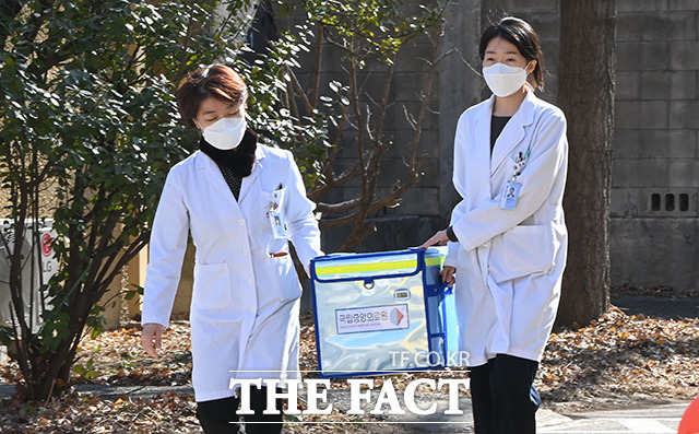 [더팩트ㅣ사진공동취재단] 9일 오후 서울 중구 국립중앙의료원 종합암예방접종센터에서 열린 백신 접종 모의 훈련에서 의료진이 백신을 옮기고 있다.