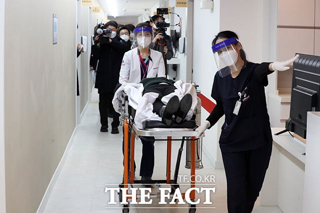 [더팩트ㅣ사진공동취재단] 9일 서울 중구 국립중앙의료원 중앙예방접종센터에서 진행된 코로나19 백신 접종 모의훈련에서 의료진들이 백신 접종 후 이상증세를 보인 참가자를 구급차로 이송하고 있다.