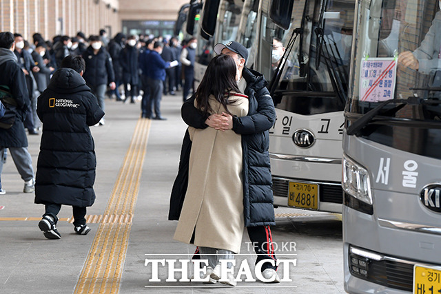 [더팩트|이선화 기자] 설 연휴를 하루 앞둔 10일 오후 서울 서초구 고속버스터미널에서 연인들이 귀성 버스에 탑승하기 전 인사를 나누고 있다.
