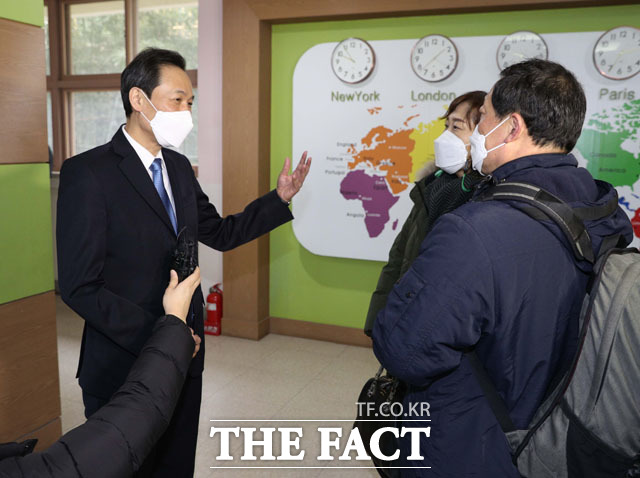 [더팩트ㅣ국회사진취재단] 더불어민주당 4.7 서울시장 보궐선거 예비후보인 우상호 의원이 16일 오전 서울 서대문구 북성초등학교를 방문해 돌봄교사들과 대화를 하고 있다.