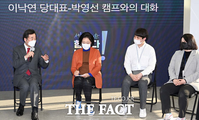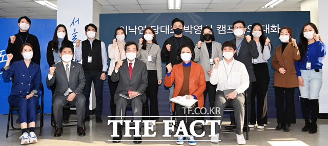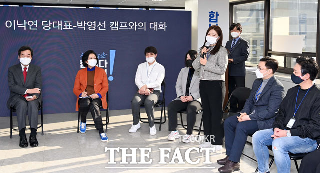 [더팩트ㅣ국회사진취재단] 더불어민주당 이낙연 대표가 18일 오후 서울 종로구에 위치한 더불어민주당 박영선 서울시장 예비후보 캠프를 방문해 인사말을 하고 있다.