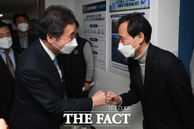 [더팩트ㅣ남윤호 기자] 이낙연 더불어민주당 대표(왼쪽)가 19일 오후 서울 영등포구에 마련된 더불어민주당 우상호 서울시장 경선후보의 선거 캠프를 방문해 우 후보와 인사를 하고 있다.
