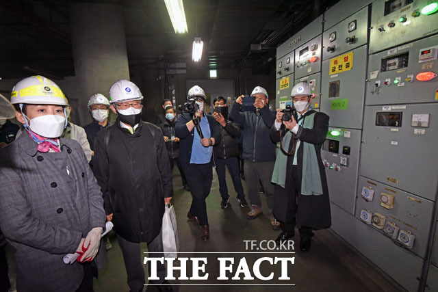 [더팩트ㅣ국회사진취재단] 나경원 국민의힘 서울시장 예비후보가 25일 오전 서울 서대문구 충정로역사 내 환기실에서 지하철 역무원에게 환기시설에 관한 설명을 듣고 있다.