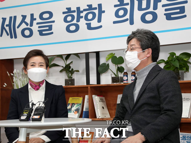 [더팩트ㅣ국회사진취재단] 국민의힘 나경원 서울시장 보궐선거 예비후보(왼쪽)가 25일 오후 서울 영등포구 여의도 희망22 사무실에서 유승민 전 의원을 만나 주먹인사를 하고 있다.