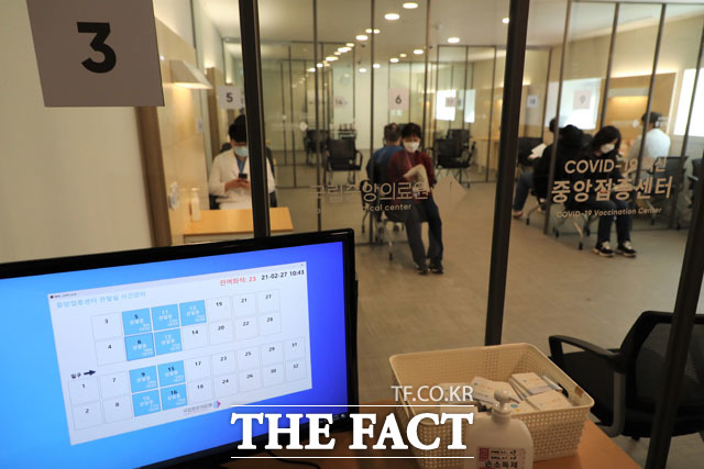 [더팩트ㅣ사진공동취재단] 화이자의 코로나19 백신 접종이 시작된 27일 오전 서울시 중구 을지로 국립중앙의료원 중앙예방접종센터에서 코로나19 화이자 백신을 맞은 의료진들이 관찰실에서 대기하고 있다.ilty012@tf.co.kr사진영상기획부 photo@tf.co.kr