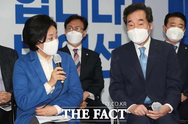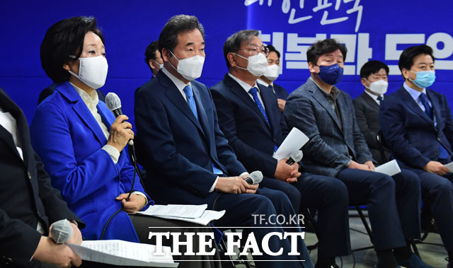 [더팩트ㅣ국회사진취재단] 이낙연 더불어민주당 대표(가운데)와 김태년 원내대표(왼쪽 두번째), 박영선 서울시장 후보자(왼쪽 세번째) 등 참석자들이 8일 오전 서울 종로구 박 후보 캠프에서 열린 제1차 중앙선대위 회의에 앞서 기념촬영을 하고 있다.