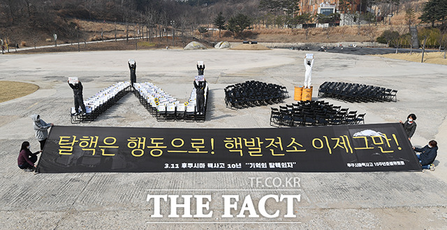 [더팩트ㅣ이동률 기자] 환경운동연합과 에너지정의행동 등 시민단체 회원들이 11일 오전 서울 마포구 문화비축기지에서 열린 '후쿠시마 핵사고 10주년, 기억의 탈핵의자 기자회견'에 참석해 탈핵 촉구 퍼포먼스를 하고 있다.