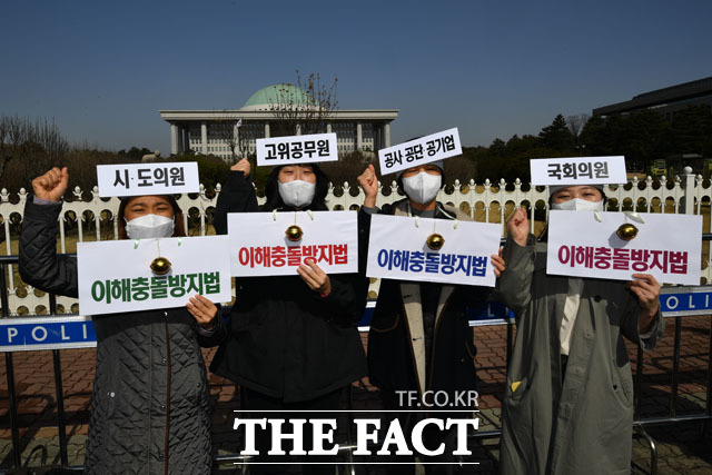 [더팩트ㅣ남윤호 기자] 참여연대, 경제정의실천시민연합, 한국투명성기구 관계자들이 16일 오전 서울 여의도 국회 앞에서 기자회견을 열고 이해충돌방지법 제정을 촉구하는 퍼포먼스를 펼치고 있다.
