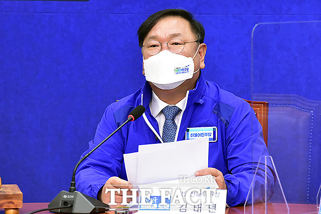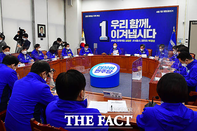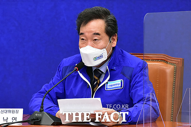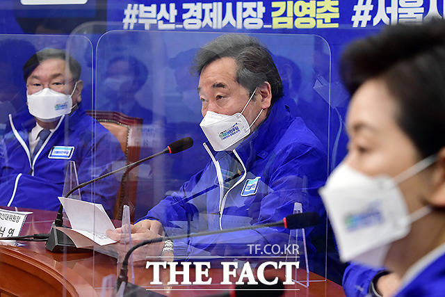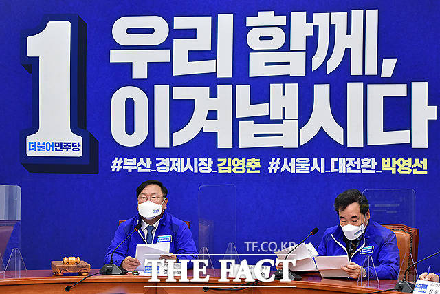 [더팩트ㅣ국회=이새롬 기자] 김태년 더불어민주당 대표 직무대행(왼쪽)과 이낙연 상임선대위원장이 24일 오전 서울 여의도 국회에서 열린 더불어민주당 중앙선대위 회의에서 대화를 하고 있다.