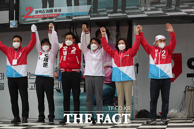 [더팩트ㅣ임영무 기자] 오세훈 국민의힘 서울시장 후보가 28일 오후 서울 강남구 코엑스 동문광장에서 안철수 국민의당 대표와 나경원 전 의원의 지원을 받으며 집중유세를 펼치고 있다.
