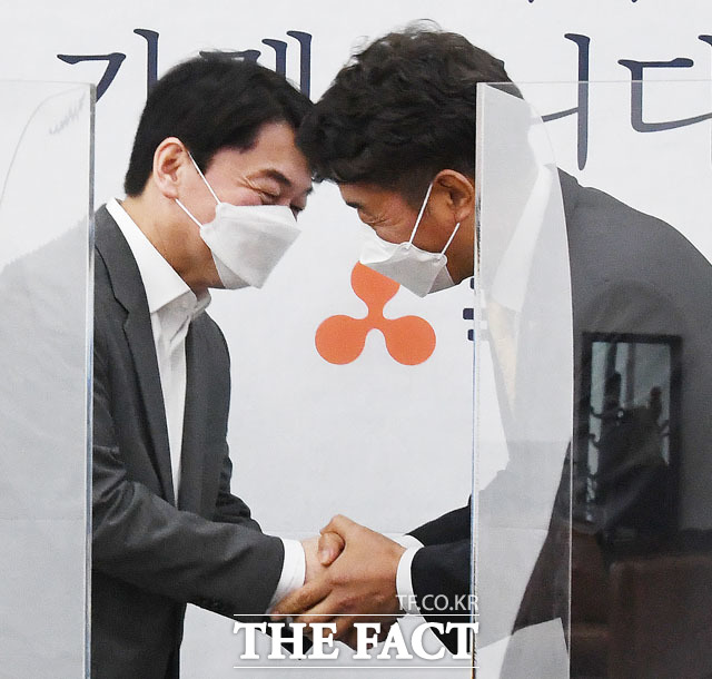 [더팩트ㅣ국회=남윤호 기자] 여영국 정의당 신임 대표가 29일 오전 서울 여의도 국회에서 안철수 국민의당 대표(왼쪽)를 예방해 인사를 나누고 있다.