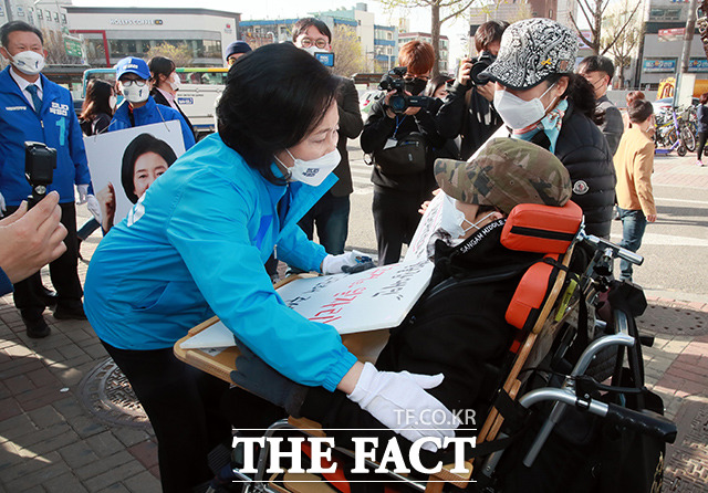 [더팩트ㅣ국회사진취재단] 박영선 더불어민주당 서울시장 후보가 1일 오전 서울 마포구 합정역에서 발달장애인과 대화하며 의견을 듣고 있다.