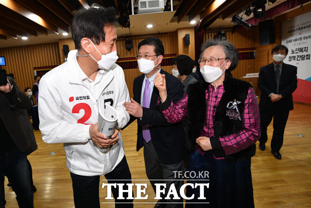 [더팩트ㅣ남윤호 기자] 오세훈 국민의힘 서울시장 후보(왼쪽)가 1일 오전 서울 종로구 종로노인종합복지관에서 열린 노인 복지 정책간담회에 참석해 한 어르신으로 부터 응원을 받고 있다.