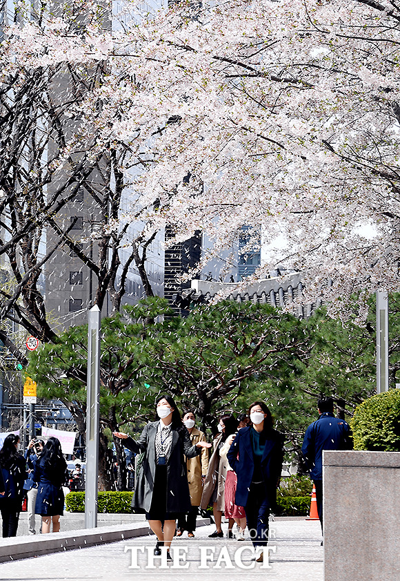 [더팩트ㅣ이새롬 기자] 완연한 봄 날씨를 보이는 1일 서울 세종로사거리 앞에서 벚꽃 비가 내리는 가운데, 시민들이 꽃비를 맞으며 걸음을 옮기고 있다.
