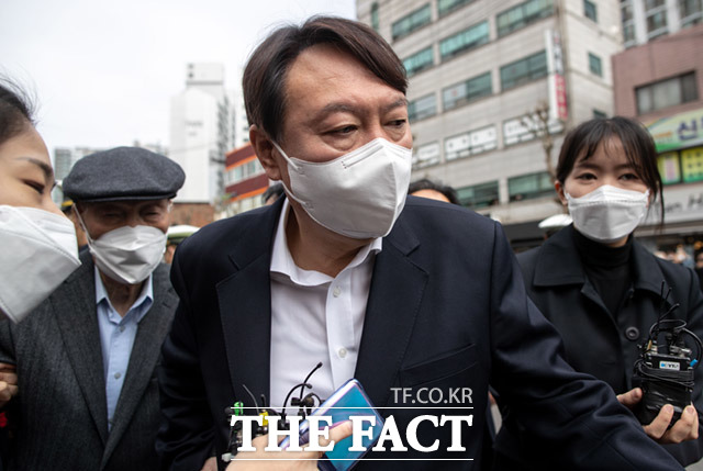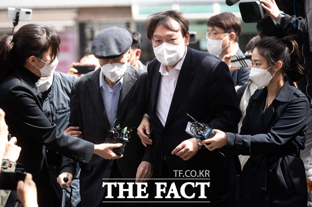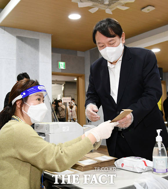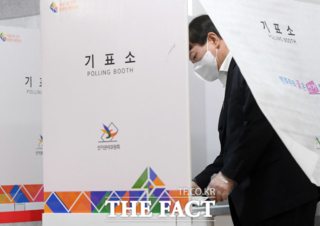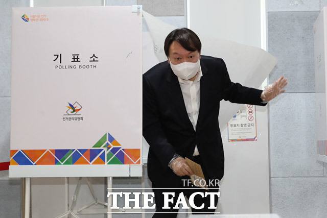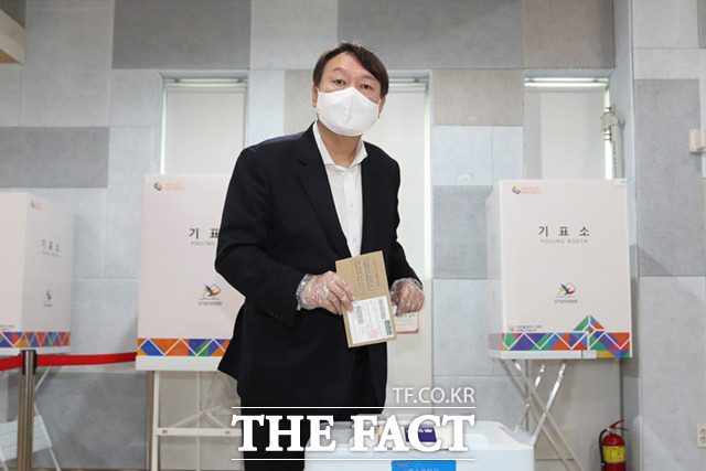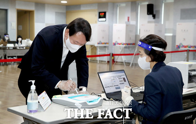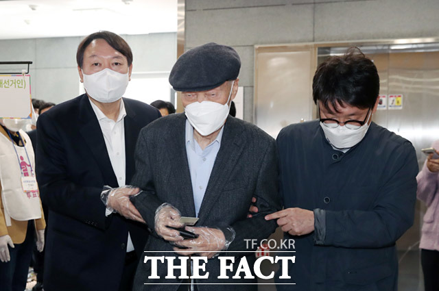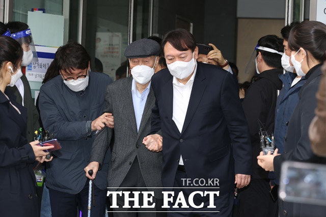 [더팩트ㅣ임세준 기자] 4.7 보궐선거 사전투표 첫날인 2일 오전 서울 서대문구 남가좌제1동주민센터에 마련된 사전투표소에서 윤석열 전 검찰총장과 아버지 윤기중 연세대 명예교수가 함께 투표를 하고 있다.