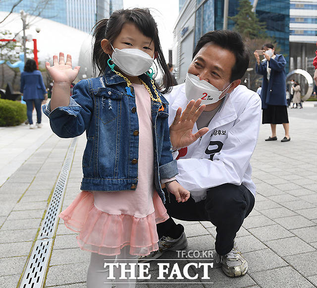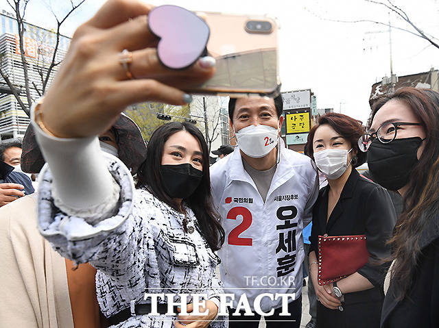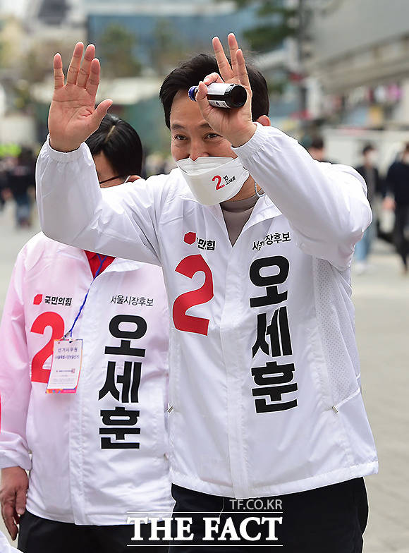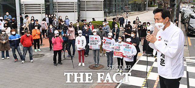 [더팩트ㅣ이새롬 기자] 오세훈 국민의힘 서울시장 후보가 2일 오후 서울 마포구 상암동DMC 일대에서 지지를 호소하며 연설하고 있다.