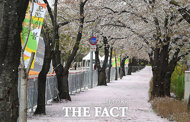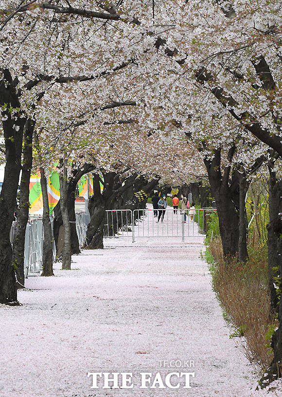 [더팩트ㅣ이새롬 기자] 4일 오전 서울 영등포구 여의도 연중로 벚꽃길에 전날 제법 많이 내린 봄비로 벚꽃잎이 떨어져 있다. 윤중로는 코로나바이러스 감염증 확산 방지를 위해 지난해에 이어 올해도 통제된 가운데, 사전 신청한 외국인과 내국인들에 추첨을 통해 일부 개방된다.