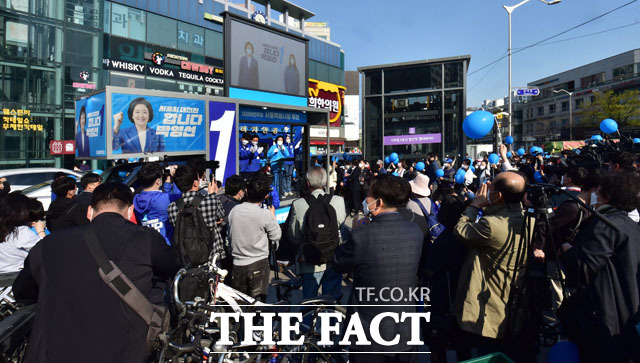 [더팩트ㅣ남윤호 기자] 서울시장 보궐선거를 이틀 앞둔 5일 오후 서울 강서구 내발산동 발산역사거리 일대에서 열린 박영선 더불어민주당 서울시장 후보의 유세 현장에 시민들이 몰려 있다.