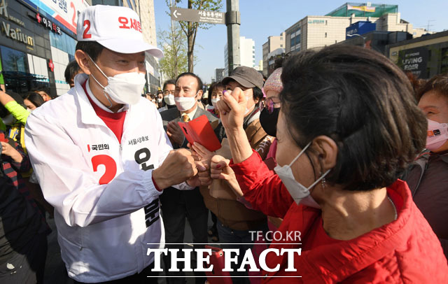 [더팩트ㅣ남윤호 기자] 오세훈 국민의힘 서울시장 후보(왼쪽)가 5일 오후 서울 강서구 등촌역 인근에서 유세를 펼치며 시민들과 인사를 나누고 있다.