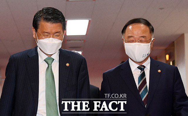 [더팩트ㅣ임영무 기자] 홍남기 경제부총리 겸 기획재정부 장관(오른쪽)과 은성수 금융위원장이 6일 오전 서울 종로구 세종대로 정부서울청사에서 영상으로 열린 국무회의에 참석하며 대화를 나누고 있다.