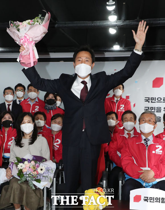 [더팩트ㅣ남윤호 기자] 당선이 확실시된 오세훈 국민의힘 서울시장 후보가 8일 오전 서울 여의도 국민의힘 중앙당사에서 꽃다발을 들고 세리머니 하고 있다.