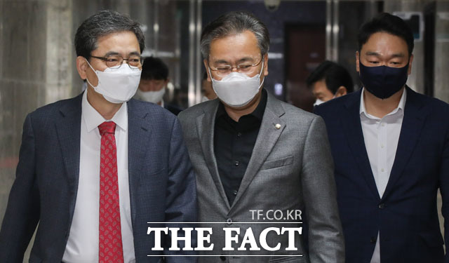 [더팩트ㅣ국회=남윤호 기자] 곽상도(왼쪽), 유상범 국민의힘 의원이 9일 오전 서울 여의도 국회에서 열린 원내대책회의에 참석하고 있다.