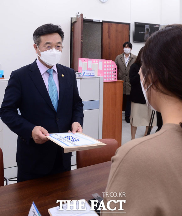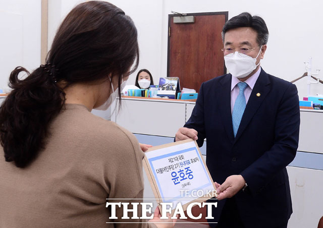 [더팩트ㅣ국회=남윤호 기자] 윤호중 더불어민주당 의원(오른쪽)이 12일 오전 서울 여의도 국회에서 제21대 국회 더불어민주당 2기 원내대표 후보자 등록을 하고 있다.