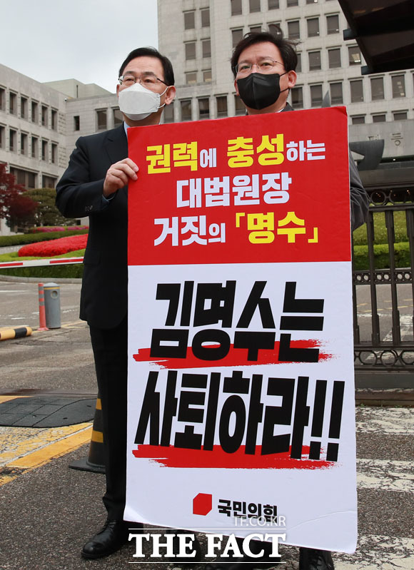 [더팩트ㅣ국회=남윤호 기자] 주호영 국민의힘 대표 권한대행(왼쪽)과 김형동 의원이 13일 오전 서울 서초구 대법원 정문 앞에서 김명수 대법원장의 사퇴를 요구하고 있다.ilty012@tf.co.kr사진영상기획부 photo@tf.co.kr