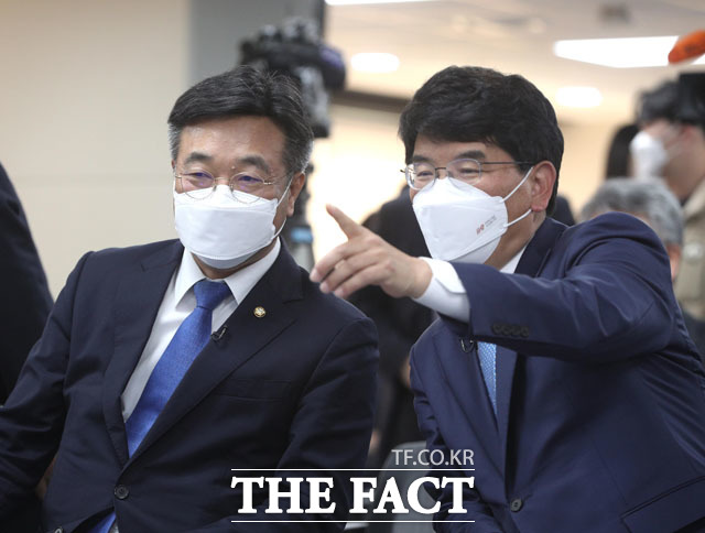 [더팩트ㅣ국회=남윤호 기자] 윤호중(왼쪽), 박완주 더불어민주당 원내대표 후보자가 13일 오후 서울 여의도 더불어민주당사에서 원내대표 후보자 합동토론회를 앞두고 대화하고 있다.