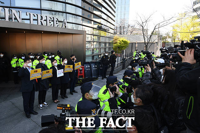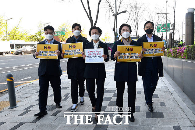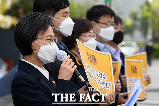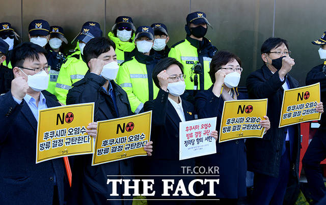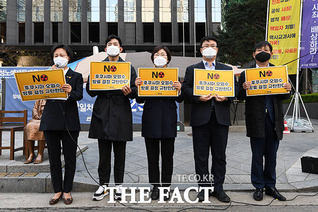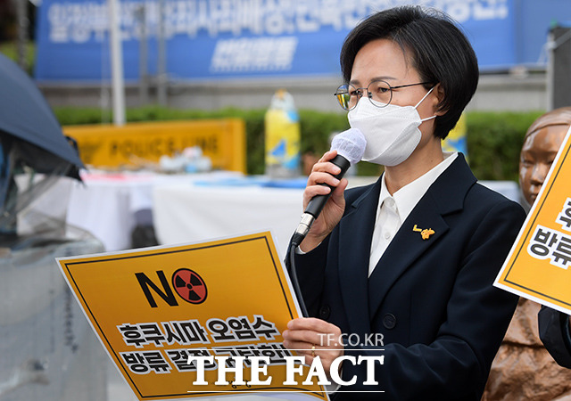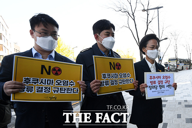 [더팩트ㅣ남용희 기자] 강은미 정의당 원내대표(왼쪽)와 정의당 지도부들이 14일 오전 서울 종로구 일본대사관 앞에서 후쿠시마 방사능 오염수 방류 결정 규탄 기자회견을 열고 손피켓을 들어보이며 발언을 하고 있다.
