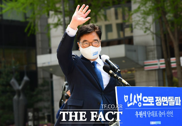 [더팩트ㅣ남윤호 기자] 우원식 더불어민주당 의원이 15일 오전 서울 중구 청계광장에서 당 대표 출마 선언을 한 후 지지자들에게 인사하고 있다.