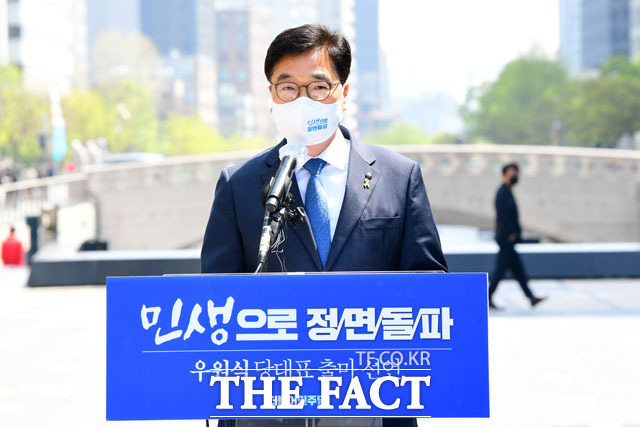 [더팩트ㅣ남윤호 기자] 우원식 더불어민주당 의원이 15일 오전 서울 중구 청계광장에서 기자회견을 열고 당 대표 출마를 선언하고 있다.