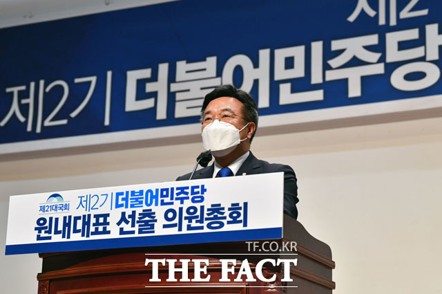 [더팩트ㅣ국회=남윤호 기자] 더불어민주당 신임 원내대표로 선출된 윤호중 의원이 16일 서울 여의도 국회 의원회관에서 당선 인사말을 하고 있다.