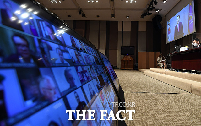 [더팩트ㅣ임영무 기자] 정세균 전 국무총리(오른쪽)가 19일 오후 서울 프레스센터 국제회의장에서 열린 '2021 세계기자대회'에서 영상으로 축사를 하고 있다.darkroom@tf.co.kr사진영상기획부 photo@tf.co.kr