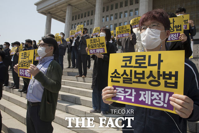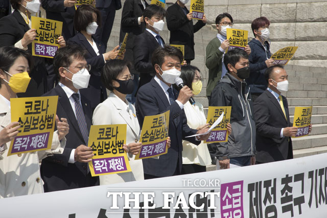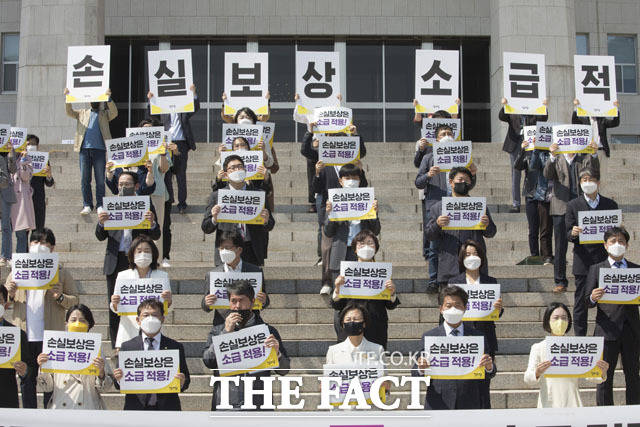 [더팩트ㅣ국회=남윤호 기자] 여영국 정의당 대표(앞줄 가운데)를 비롯한 지도부, 당직자들이 19일 오후 서울 여의도 국회 본청 앞에서 '코로나 손실보상법 소급적용 제정 촉구' 기자회견을 열고 구호를 외치고 있다.